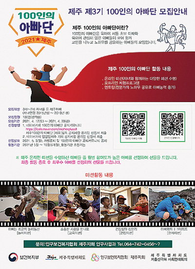 제주특별자치도와 인구보건복지협회 제주지회(회장 고신관)는 3~7세까지 자녀를 둔 육아에 관심 있는 아빠들을 대상으로 '제주 100인의 아빠단'을 모집한다고 22일 밝혔다.