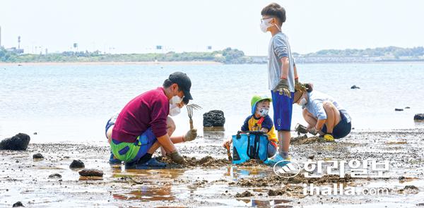 25일 서귀포시 성산일출봉 인근 갯벌에서 가족단위 나들이객들이 조개를 캐며 즐거운 시간을 보내고 있다. 이상국기자