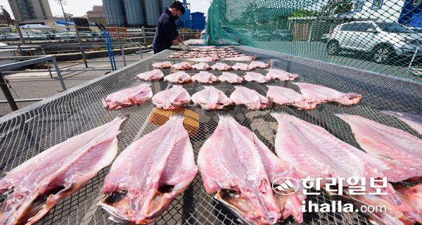 26일 제주시 한림항 인근에서 한 어민이 맑은 날씨 속에 민어 건조 작업을 하고 있다. 이상국기자