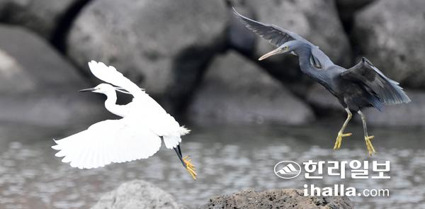 26일 제주시 애월읍 금성리 해안에서 먹이 사냥에 나선 흑로와 쇠백로가 좋은 자리를 선점하기 위해 치열한 다툼을 벌이고 있다. 이상국기자