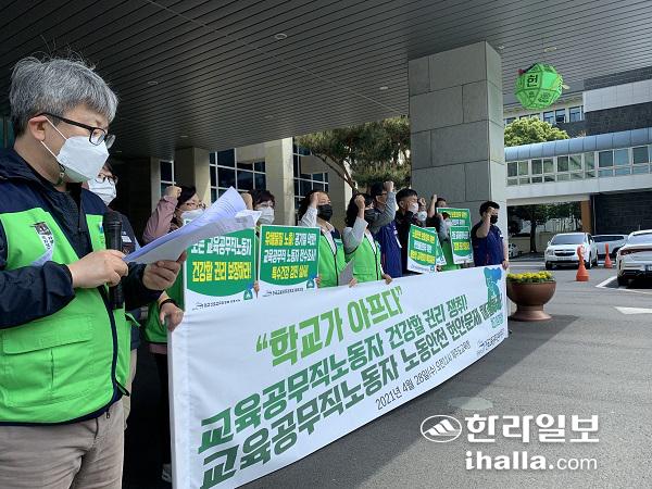 민주노총 공공운수노조 전국교육공무직본부 제주지부(이하 교육공무직 제주지부)는 28일 제주도교육청 앞에서 기자회견을 열고 "급식소 음식물감량기 하자로 인해 재해를 당한 노동자 A씨가 이석문 교육감을 상대로 1억1400만원 규모의 손해배상 청구소송을 제기했다"고 밝혔다. 송은범기자