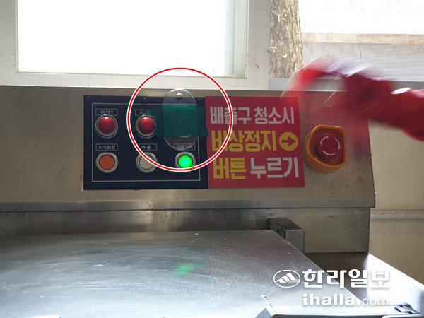 음식물쓰레기감량기 사고가 잇따르자 지난해 제주도내 한 학교 급식실 감량기 정지 버튼에는 누르지 말라는 청테이프가 붙여져 있다. 사진=교육공무직 제주지부 제공