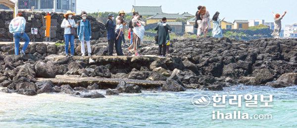 “저 바다를 배경으로…”29일 제주시 애월읍 곽지해수욕장을 찾은 관광객들이 기념사진을 찍으며 즐거운 시간을 보내고 있다. 이상국기자