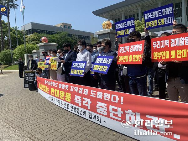 서귀포시 17개 읍·면·동 연합청년회 협의회는 30일 제주도의회 앞에서 기자회견을 열고 "신화월드 아울렛 적극 찬성 한다. 명분 없는 반대행동을 즉각 중단하라"고 촉구했다. 송은범기자