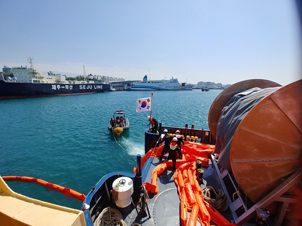 이번 훈련은 제주해양경찰서를 비롯해 제주지방해양경찰청, 제주도, 제주시, 해양자율방제대 등 6개 기관 및 단·업체에서 80여명, 선박 5척, 오일펜스 200m 등이 동원됐다. 내용은 제주항 내 입항 중이던 화물선이 제주항에 계류돼 있는 유조선과 충돌, 기름 약 5㎘가 해상에 유출된 사고를 가상해 이뤄졌다.