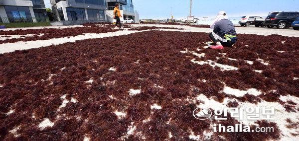 27일 제주시 구좌읍 평대어촌계 작업장 앞에서 어민들이 우뭇가사리 건조 작업으로 분주한 시간을 보내고 있다. 이상국기자