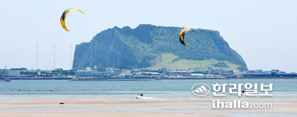 7일 제주시 구좌읍 종달리 해안가에서 관광객들이 일출봉을 배경으로 카이트서핑을 즐기고 있다. 이상국기자
