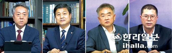 사진 왼쪽부터 김태윤 제주연구원 선임연구위원, 김영배 국회의원, 송재호 국회의원, 홍영철 제주참여환경연대 공동대표.