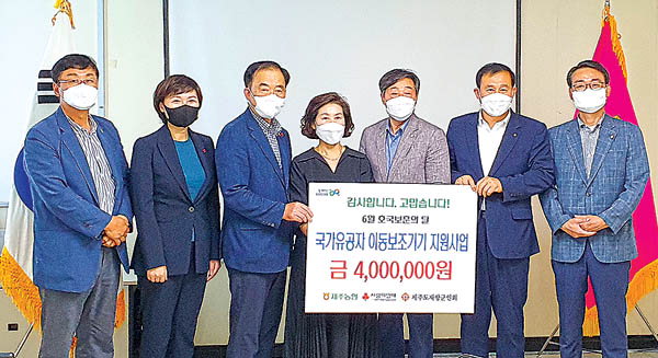 농협제주지역본부(본부장 강승표)와 제주사회복지공동모금회(회장 김남식)는 호국 보훈의 달을 맞아 지난 18일 제주도재향군인회(회장 김달수)에 고령 국가유공자의 이동 안전망 구축을 위한 이동보조기기 지원기금 400만원과 제주시자원봉사센터(센터장 이승희)가 전개하는 '2021 안녕캠페인'으로 재능기부받은 청소년 나라사랑 감사엽서도 함께 전달했다.