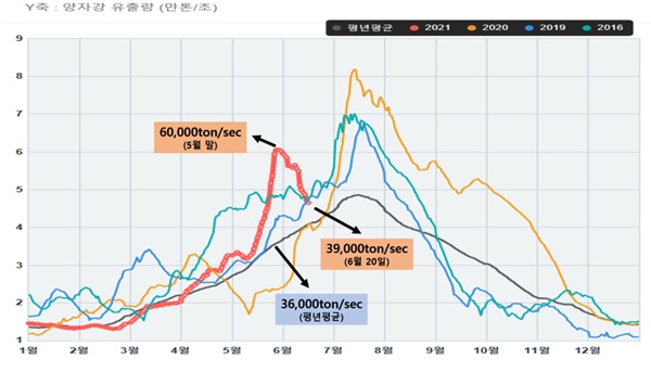 앞서 지난해엔 평년 대비 여름철 평균기온이 높고 6월 중순부터 이어진 장마 영향으로 양자강 유출량이 급증했다.