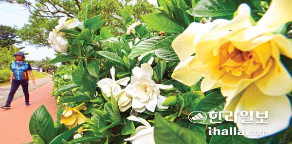 26일 제주시 건입동 한 인도변에 활짝핀 치자꽃이 향기를 내뿜고 있다. 이상국기자