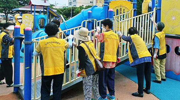 제주시 이도노인자원봉사클럽(코치 양기순) 회원 20명으로 구성된 '노란쪼끼단'은 지난 10일 지역내에 위치한 어린이놀이터에서 사회에 봉사하는 노인상 이미지 구현에 앞정서기 위해 코로나19 감염병 예방을 위한 운동기구 소독 활동을 전개했다.