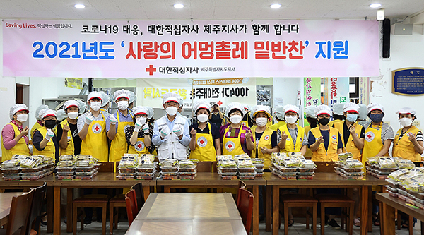 대한적십자사제주특별자치도지사(회장 오홍식)는 지난 6일부터 8일까지 신협 두손모아봉사단(단장 여혜숙), 제주양돈농협(조합장 고권진) 임직원 및 적십자봉사원 등 40여명과 함께 취약계층 400가구를 위한 사랑의 어멍촐레 밑반찬을 만들어 전달했다. 이날 만들어진 밑반찬은 돼지갈비찜, 오이부추무침, 김치, 김 등 총 4가지로 구성됐으며 제주양돈농협은 제육볶음을 위한 돼지고기 전지 150㎏을 밑반찬 재료로 적십자사에 기탁했다.