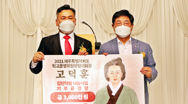 제주특별자치도학교운영위원장협의회 고덕훈 회장은 지난 9일 김만덕기념관(관장 김상훈)에 김만덕 사랑의 쌀 10t(3000만원 상당)을 기탁했다. 고덕훈 회장은 "2021년 신임 회장 취임을 맞이해 김만덕의 정신을 잇는 나눔사업에 동참하게 돼 기쁘다"며 "아이들이 행복한 학교생활을 위해 최선의 노력을 다하겠다"는 소감을 밝혔다. 이날 기탁된 쌀은 도내 개별 세대와 사회복지시설 등 어려운 이웃들에게 전달될 예정이다.