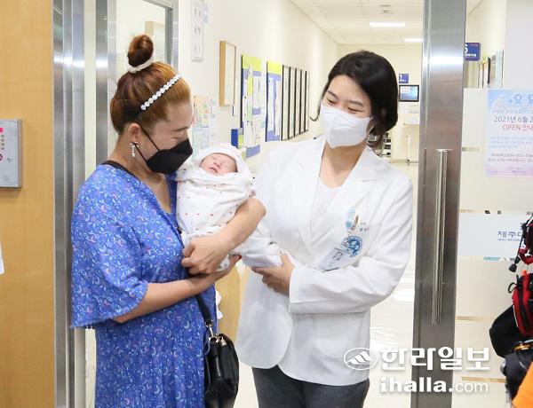 김리나 교수와 아기를 안고 있는 강씨. 사진=제주대학교병원 제공