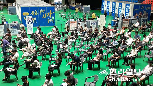 제주지역에서 55~59세 연령층 및 코로나19 고위험군에 대한 백신 접종이 26일부터 시작되면서 제주시 한라체육관에 마련된 예방접종센터가 붐비고 있다. 강희만기자