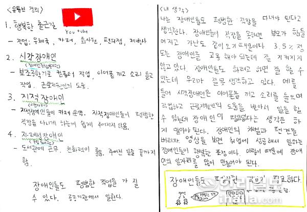 학생들은 기사분석을 통해 현실에서 벌어지는 일들에 대해 이해할 수 없다는 반응을 보였다. 장애인 인권은 장애인 노동권이 보장됐을 때 완성된다는 논리를 알아가는 시간이 됐다.