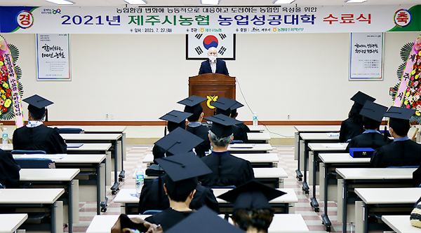 제주시농협(조합장 고봉주)은 지난달 27일 농산물공판장 2층 회의실에서 2021년 농업성공대학 학사과정을 마무리하고 수료식을 개최했다. 지난 5월 개강한 농업성공대학은 3개월동안 운영해 총 44명의 수료생을 배출했다.