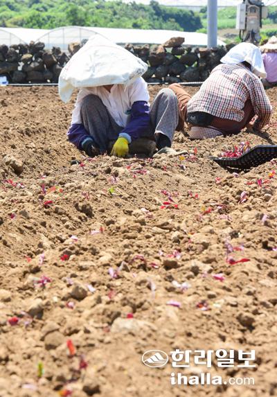 지난 7일 제주시 애월읍 한 밭에서 농민들이 구슬땀을 흘리며 비트 파종작업을 하고 있다. 이상국기자