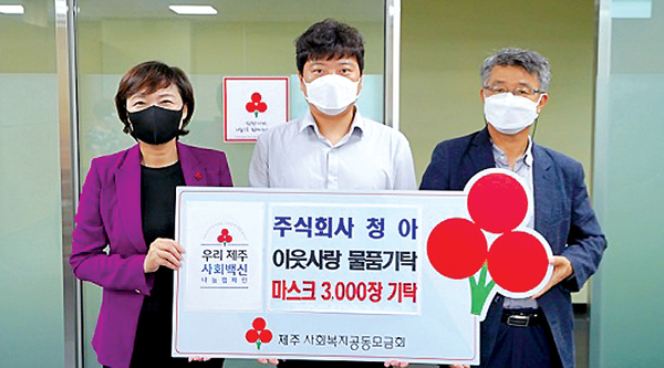 주식회사 청아(대표 정민호)는 지난 6일 지역사회 어려운 이웃들을 위해 사용해달라며 이웃사랑 마스크 3000장을 제주사회복지공동모금회(회장 김남식)에 기탁했다.