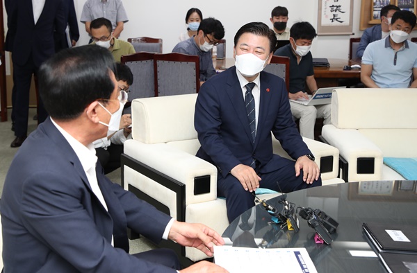 제주자치도의회를 찾은 구만섭 제주지사 권한대행(오른쪽).
