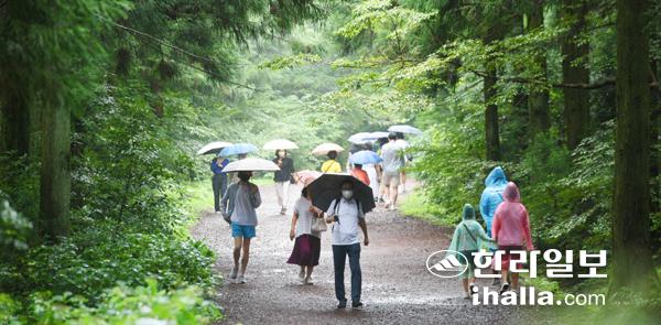 비날씨를 보인 12일 사려니숲길을 찾은 도민과 관광객들이 가족·친구들과 함께 삼나무숲길을 걸으며 힐링을 하고 있다. 살포시 안개가 걷히며 드러난 숲길이 신비하면서도 더없이 청량하다. 이상국기자