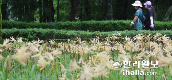 17일 제주시 한라수목원에 아름다운 상사화가 만개해 시선을 끌고 있다. 꽃이 필 때 잎이 없고, 잎이 자랄 때는 꽃이 피지 않아 서로 볼 수 없다고 하여 상사화라는 이름이 붙여졌다. 이상국기자
