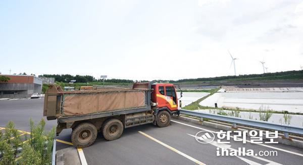 동복리마을회가 18일 오후부터 환경자원순환센터 매립장 진입로를 중장비로 봉쇄했다. 이상국 기자