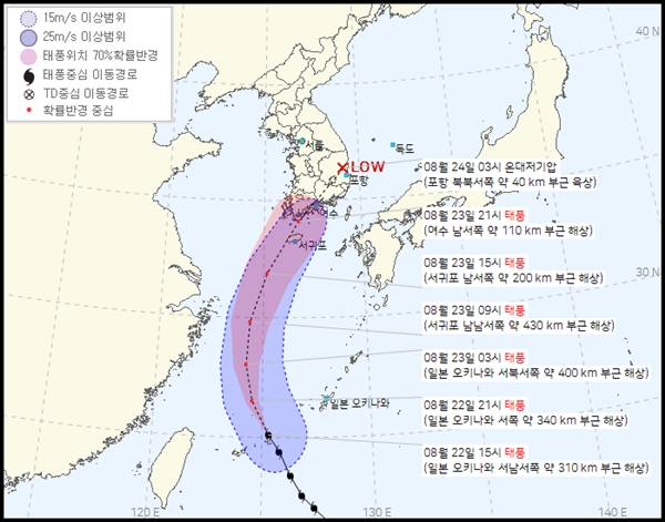 이후 오마이스는 23일 오전 9시 서귀포 남남서쪽 약 430㎞ 부근 해상에 위치하겠고, 6시간 뒤에는 제주를 지나 여수 남서쪽 약 110㎞ 부근 해상까지 진출하겠다.