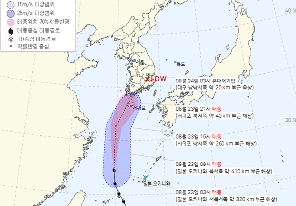 육상에도 태풍과 서해상에서 다가오는 저기압의 영향으로 많은 비가 내릴 것으로 보인다. 23~24일 예상강수량은 100~300㎜, 많은 곳은 제주도산지를 중심으로 400㎜ 이상이다.