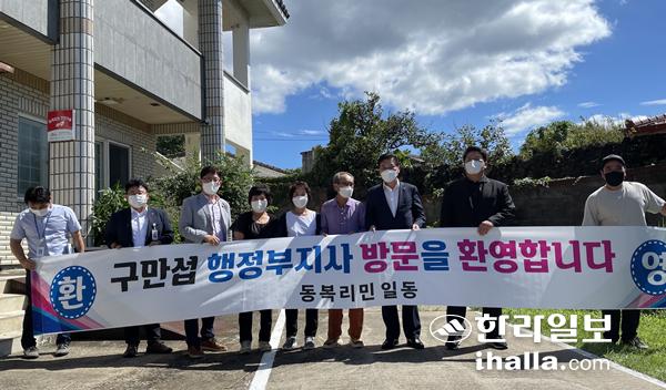 27일 제주시 구좌읍 동복리 마을회관에서 제주도-동복리 간담회가 열렸다. 사진은 간담회가 끝난 뒤 기념촬영이 이뤄지는 모습. 송은범기자.