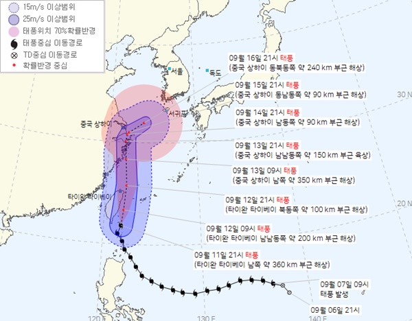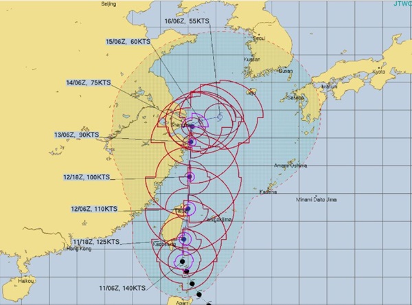 11일 오후 10시 현재 제14호 태풍 '찬투' 예상 진로도.