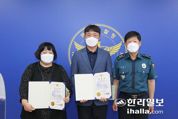 사진 왼쪽부터 박어진씨와 송민석 경위, 강황수 제주청장. 사진=제주경찰청 제공
