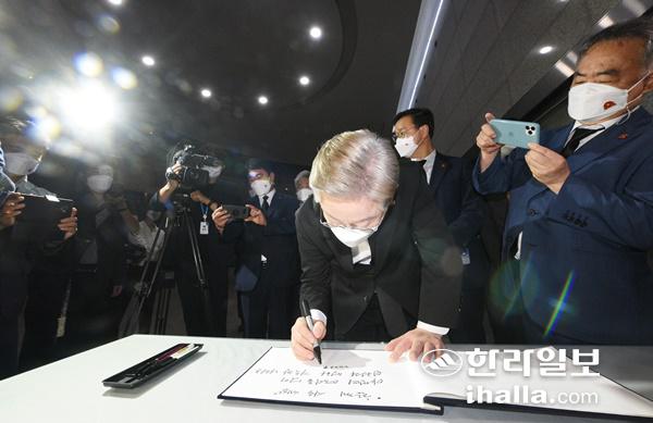 27일 제주4.3평화공원을 방문한 이재명 민주당 대선경선후보가 방명록을 작성하고 있다. 이상국기자