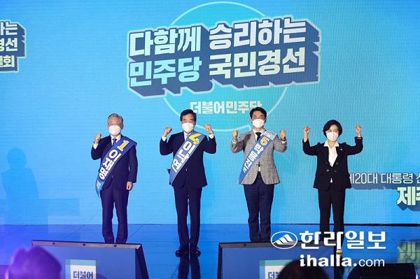 제주시 호텔 난타에서 열린 민주당 대선주자 전국 순회 합동연설회에서 이재명, 이낙연, 박용진, 추미애 후보(사진 왼쪽부터)가 지지를 호소하고 있다. 이상국 기자