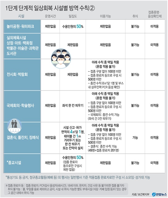 행사·집회는 접종 여부 구분 없이 100명 미만까지 가능하다. 접종완료자, PCR 음성확인자, 18세 이하 등만 참여하면 500명 미만으로 열 수 있다. 공청회, 기념행사, 사인회, 수련회, 강연회, 결혼식, 돌잔치, 피로연 등 모든 행사가 이 기준을 따르게 된다.