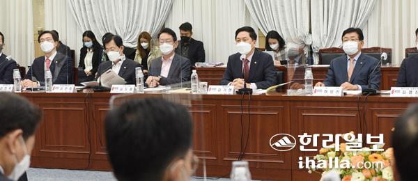 2일 제주도청 4층 탐라홀에서 열린 제주도-국민의힘 중앙당 예산정책협의회에서 김기현 국민희임 원내대표가 발언하고 있다. 이상국기자