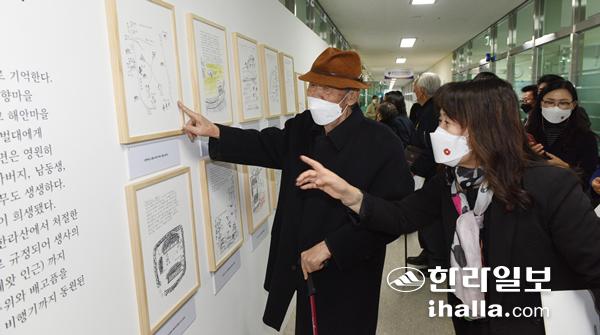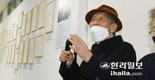 현상지(91) 할아버지가 9일 4.3트라우마센터에서 열린 자신의 그림전에서 발언을 하고 있다. 이상국기자.