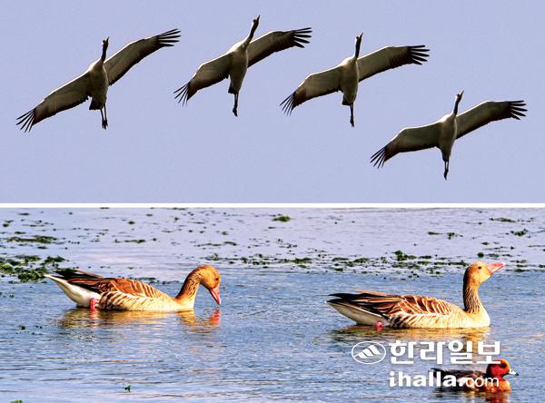 우리나라에서는 좀처럼 관찰이 힘든 검은목두루미(천연기념물 제451호. 환경부지정 멸종위기 2급) 4마리(사진 위)와 회색기러기 2마리가 제주를 찾은 모습이 카메라에 잡혔다. 사진=한국조류보호협회 제주도지회 제공