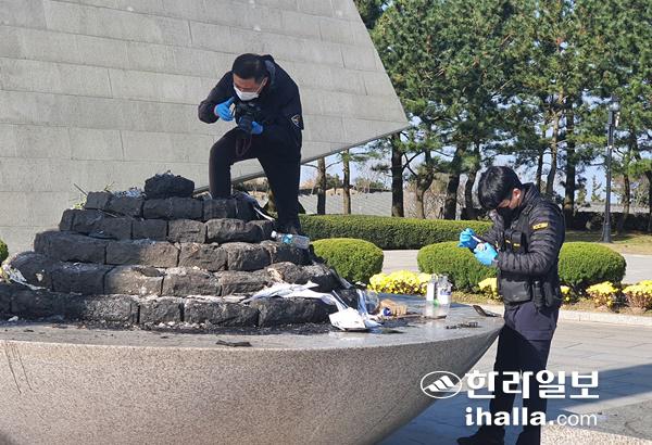 경찰이 18일 방화사건이 발생한 43평화공원을 찾아 현장감식을 벌이고 있다.