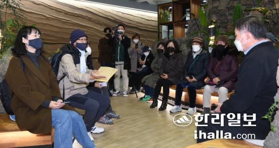 22일 이상영 선흘2리 이장과 제주동물테마파크 반대대책위원회 위원들이 제주도청에서 도청 관계자와 이야기를 하고 있다. 이상국기자