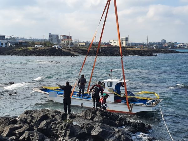 제주시 구좌읍 연안에서 좌초돼 발견된 A호의 모습. 사진=제주해양경찰서 제공