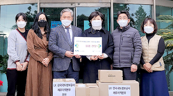 LX 한국국토정보공사 제주지역본부(본부장 김영욱)는 지난 13일 제주시 한경면 소재 '애서원'을 방문해 100만원의 상당의 물품을 전달했다. LX 한국국토정보공사 제주지역본부는 꾸준한 사회공헌활동을 지속적으로 전개해 오고 있다. 김영욱 본부장은 "이후 임애덕 원장과 대화를 통해 더 많은 지원을 할 수 있도록 노력하겠다"고 말했다.