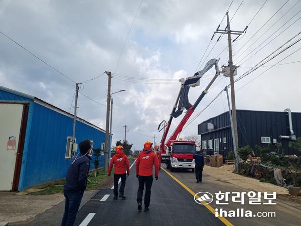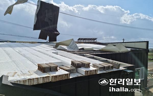 17일 낮 12시20분쯤에는 서귀포시 대정읍 신도리에서 조립식 판넬이 바람에 날려 전신주에 걸리는 사고가 있었다. 서부소방서 제공