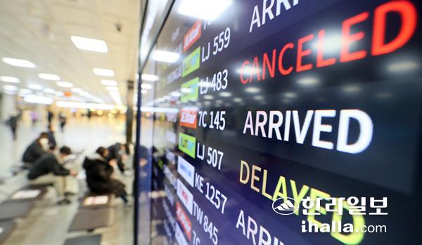전국의 기상이 악화한 17일 오후 제주국제공항 도착층의 안내판에 결항과 지연 항공편이 표시되고 있다. 연합뉴스
