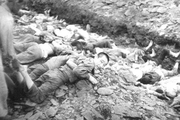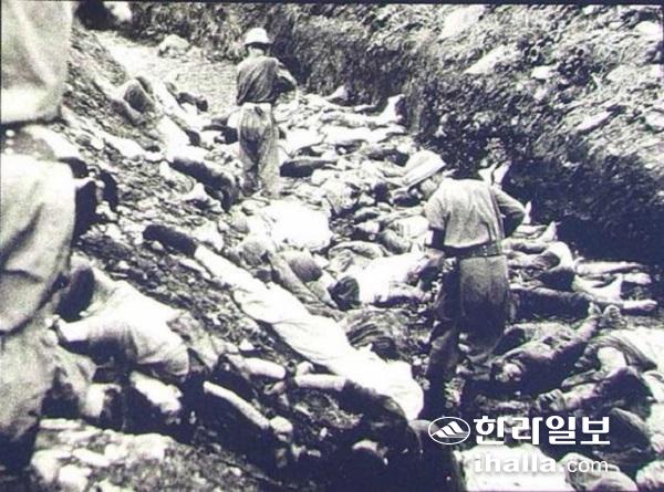 애버트 미군 소령이 찍은 대전 골령골 학살 모습. 무릎을 꿇린 채 뒤통수에 총을 겨눈 것을 보면 1950년 7월 초중순 벌어진 학살로 추정된다. 대전형무소에 수감돼 골령골에서 희생된 제주4·3 수형인들이 이러한 방식으로 희생됐기 때문에 사진 속 인물이 제주도민일 수도 있다.