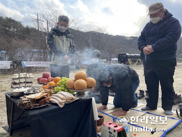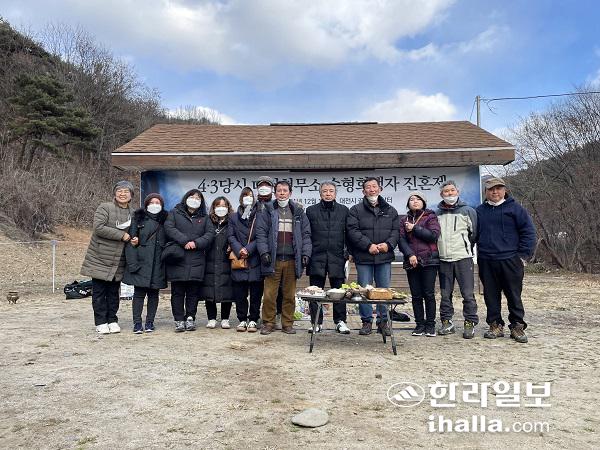 제주4·3진상규명과 명예회복을 위한 도민연대(대표 양동윤)는 골령골 학살터에서 '대전형무소 4·3수형인 희생자를 위한 진혼제'를 거행한 뒤 음복을 하는 모습. 최대 7000명이 학살됐지만, 아직까지 제대로 된 추모시설이 없이 휑한 풍경이 보인다. 송은범기자