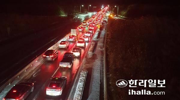 지난 17일 밤 도로 결빙으로 평화로에 고립된 차량들. 독자제보