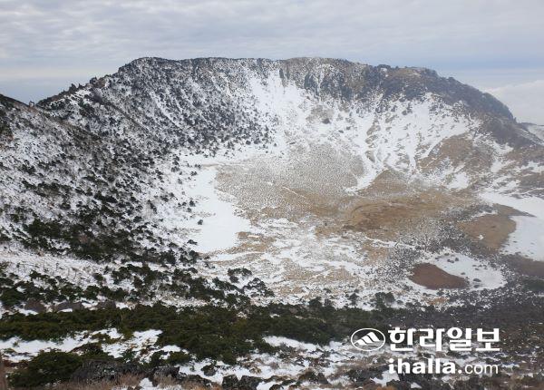 크리스마스이브인 24일 오후 제주 한라산 백록담에 눈이 살포시 쌓여있다. 연합뉴스