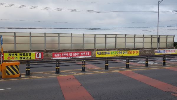 제주시 구좌읍 한동리 일대에 게시된 양돈시설 반대 현수막.